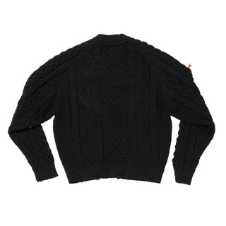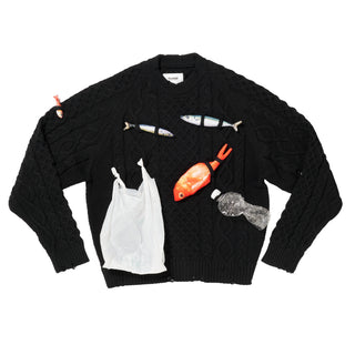 日本由来100%の魚網をリサイクルして生まれたナイロン糸「MURON」を、コットンでカバーリングして編んだフィッシャーマンニット。ケーブル編みが網のように飛び出し、そこに金目鯛やビニール袋、ペットボトルなどが絡みついています。まるで海に漂う漁網のように、命と廃棄物の両方を巻き込む編み目に仕上げました。