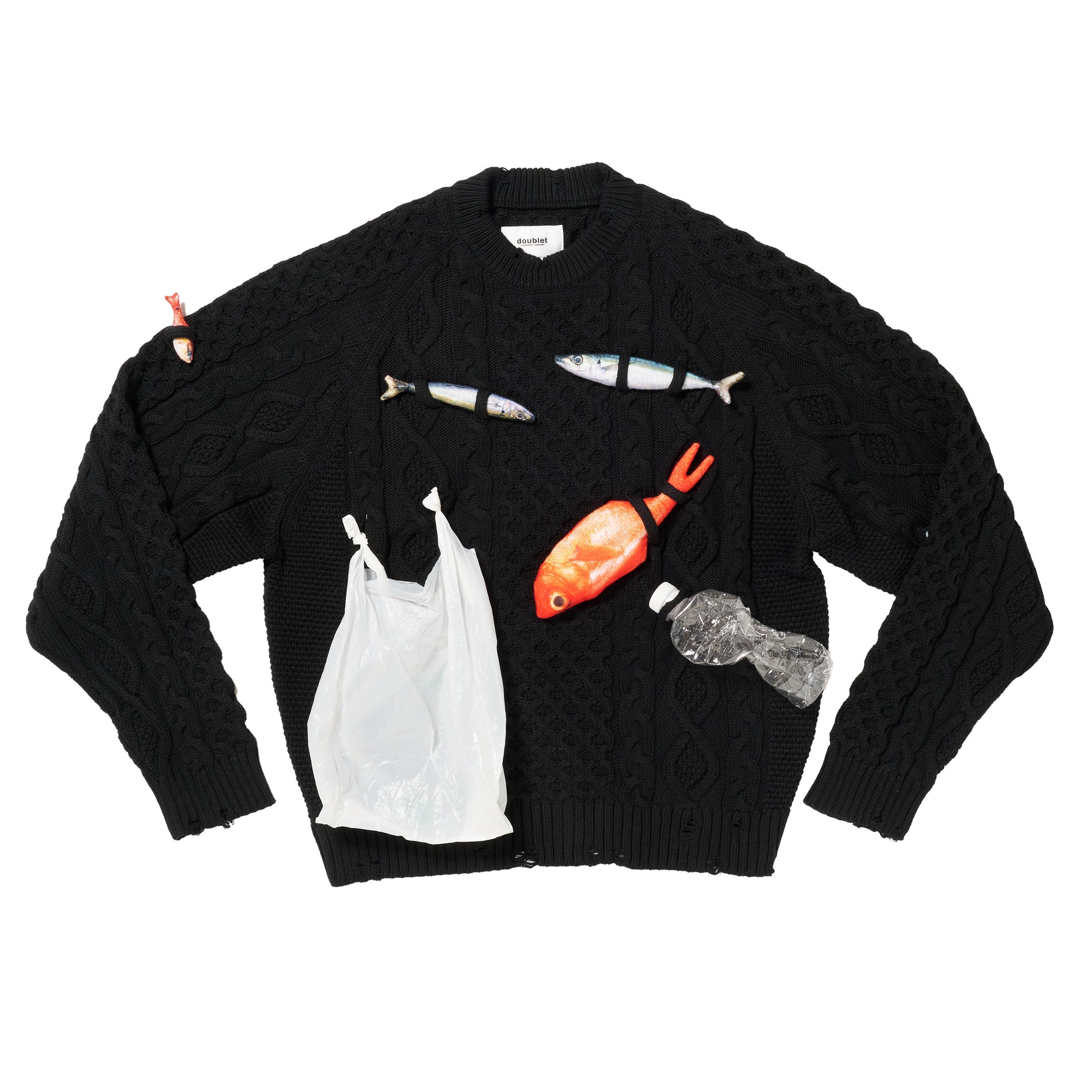 A FISHERMAN KNIT MADE FROM “MURON”—A JAPANESE NYLON YARN UPCYCLED FROM DISCARDED FISHING NETS—COVERED WITH COTTON FOR A NATURAL TOUCH. THE CABLE STITCHES EXTEND LIKE TANGLED NETS, CATCHING FISH, PLASTIC BAGS, AND BOTTLES ALONG THE WAY.