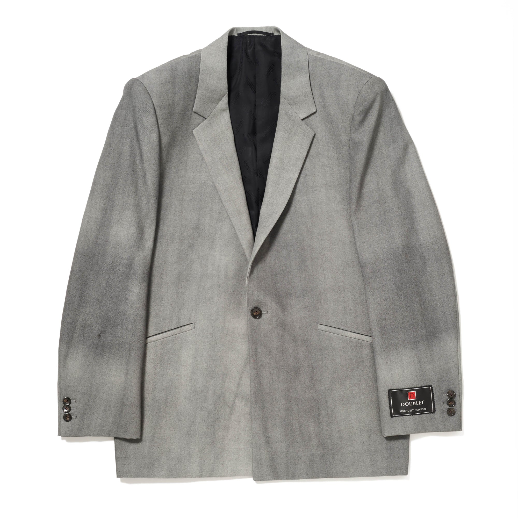 スプレーで染色し、色ムラの表情をあえて残した生地を使用したテーラードジャケット。シングルブレストの端正なシルエットに、背中の継ぎ目のない仕様がさりげなく個性を添えています。