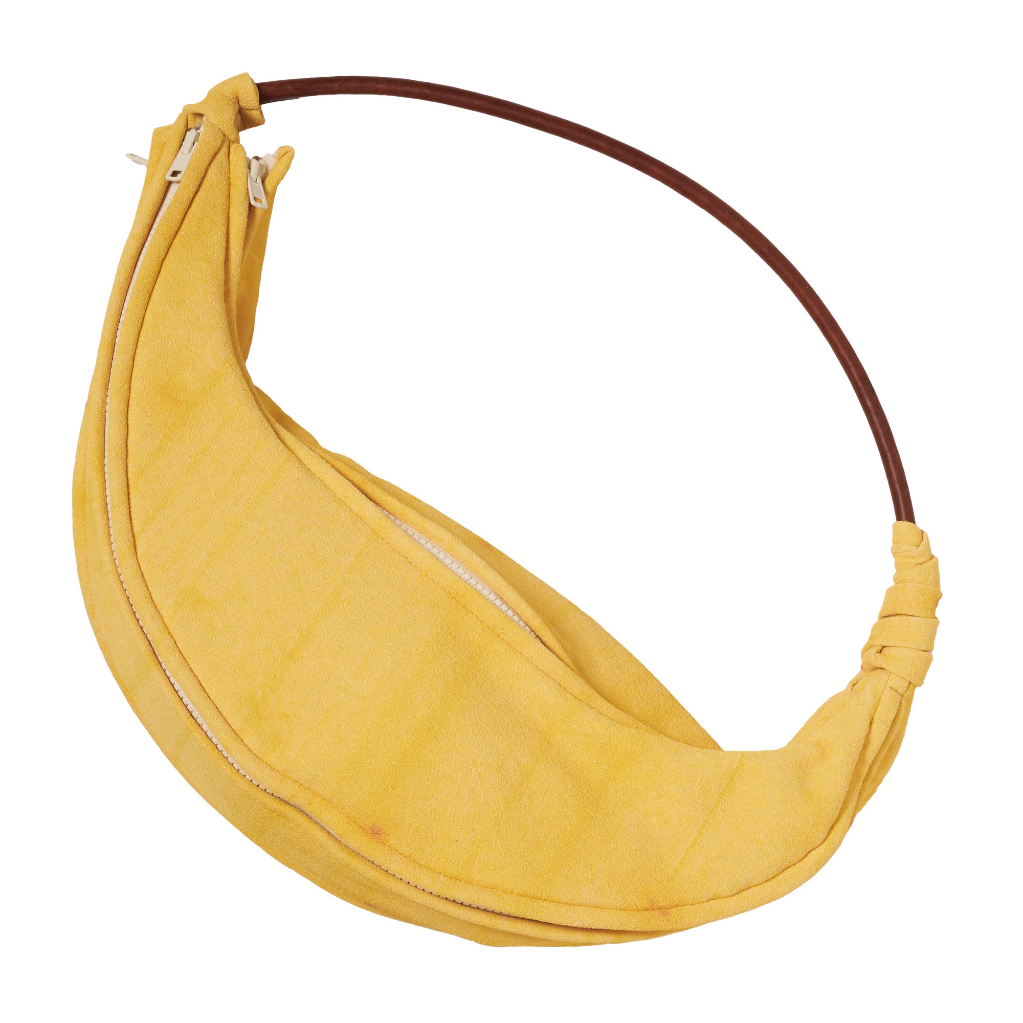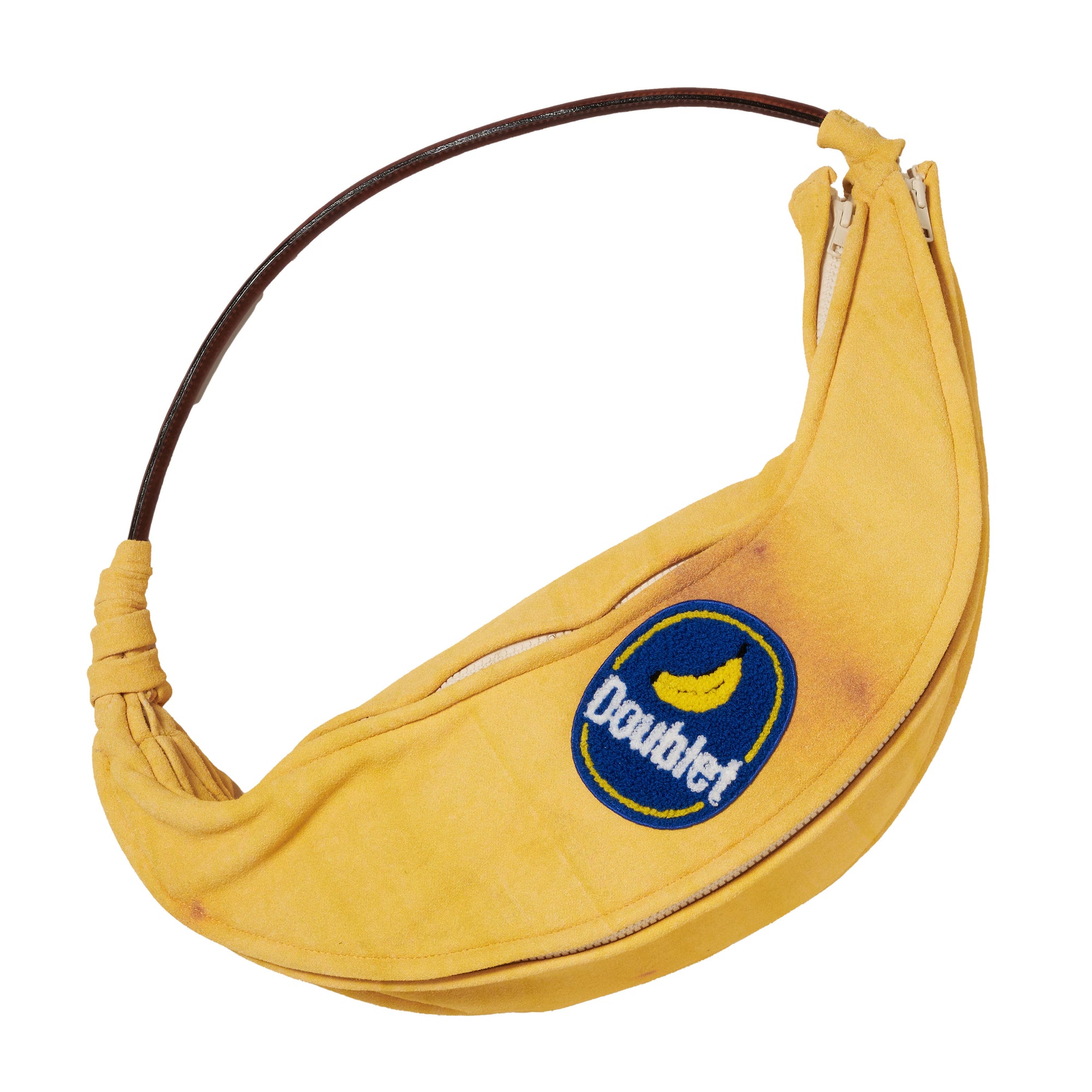 A BAG MADE FROM SWEATSHIRT FABRIC BLENDED WITH BANANA FIBER AND COTTON, DESIGNED TO LOOK LIKE A SLIGHTLY OVERRIPE BANANA. THE SOFT LOOPBACK INTERIOR RESEMBLES THE INNER SIDE OF A REAL BANANA PEEL, WHILE THE OUTER SURFACE FEATURES A LARGE-SCALE INKJET PRINT BASED ON AN ACTUAL BANANA PEEL, ENLARGED INTO A PATTERN. BY OPENING THE ZIPPER, THE BAG CAN EVEN EXPRESS THE MOMENT OF A BANANA BEING PEELED.