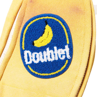 バナナ繊維とコットンを使った裏毛素材で仕立てた、腐りかけのバナナに見えるバッグ。裏毛のふわふわした起毛面は、バナナの皮を剥いた内側の質感を思わせるよう設計され、思わず触りたくなるリアルさを備えています。表面には本物のバナナの皮を剥いて型紙にし、そのサイズを大胆に拡大したグラフィックをインクジェットで再現。ファスナーの開閉によって、剥き途中の状態まで表現できる構造です。