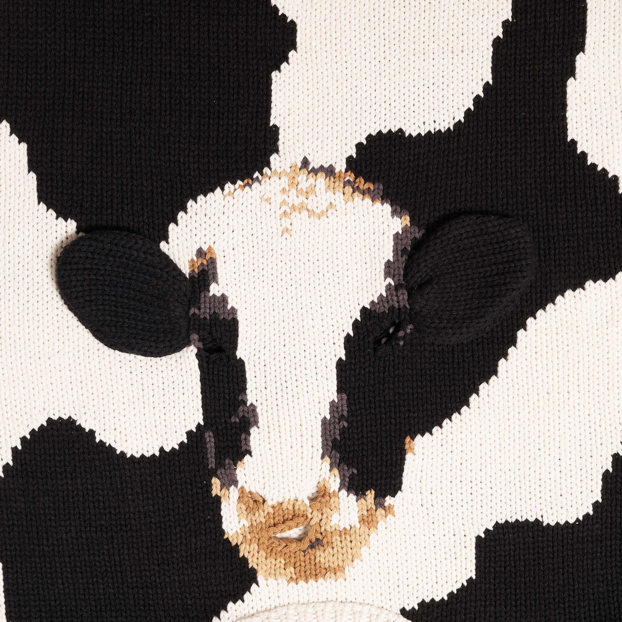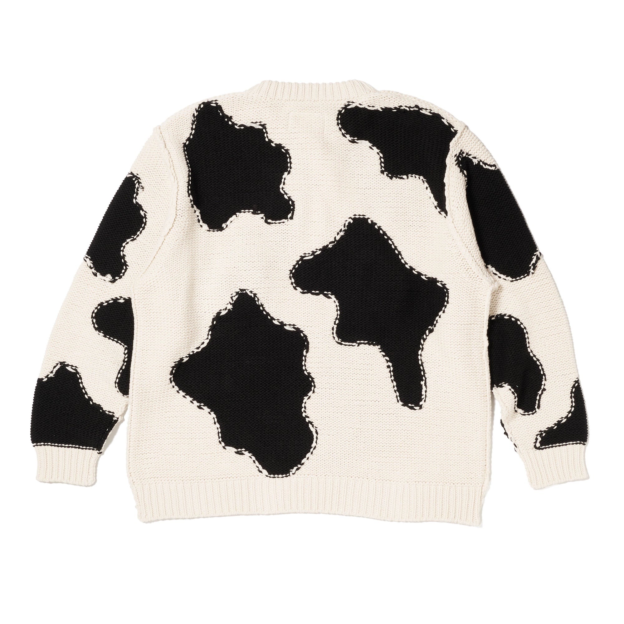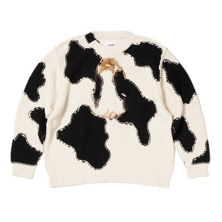 THIS KNIT PULLOVER IS CRAFTED IN AN ALL-OVER COW PATTERN. FLIP THE HEM OVER YOUR HEAD TO REVEAL A HAND-KNIT COW FACE THAT PERFECTLY OVERLAPS WITH YOUR OWN, COMPLETE WITH CUTE EARS—TRANSFORMING YOU INTO A COW IN AN INSTANT.