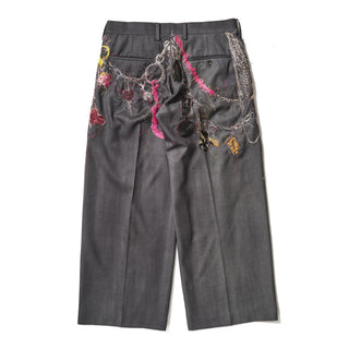 まるでチェーンアクセサリーを腰に巻き付けているようなスラックス。しかし、よく見るとそれは精巧な刺繍で表現されたもの。犬やハートなどのモチーフが散りばめられており、細やかな遊び心が詰まっています。