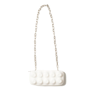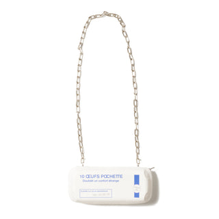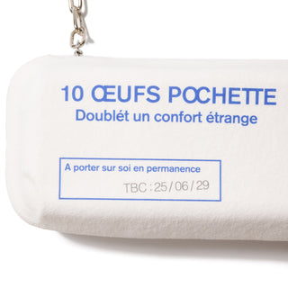 A CHAIN STRAP ALLOWS IT TO BE WORN AS A SHOULDER POUCH. FINISHED TO LOOK AS IF YOU’RE CARRYING A REAL EGG CARTON, THIS PIECE MIGHT MAKE YOU WANT TO STRUT THROUGH THE SUPERMARKET JUST TO SHOW IT OFF. WE HOPE THIS POUCH BRINGS A TOUCH OF PLAYFULNESS TO YOUR EVERYDAY LIFE.