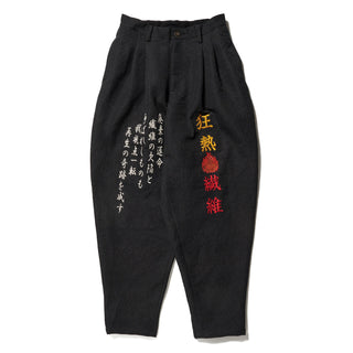 THE DESIGN SOURCE FOR THESE PANTS IS THE "BONTAN PANTS" WORN BY "BŌSŌZOKU," JAPANESE OUTLAW BIKER GANGS, WHO SOUGHT FREEDOM BUT NEVER FIT WITHIN SOCIETY'S FRAMEWORK.