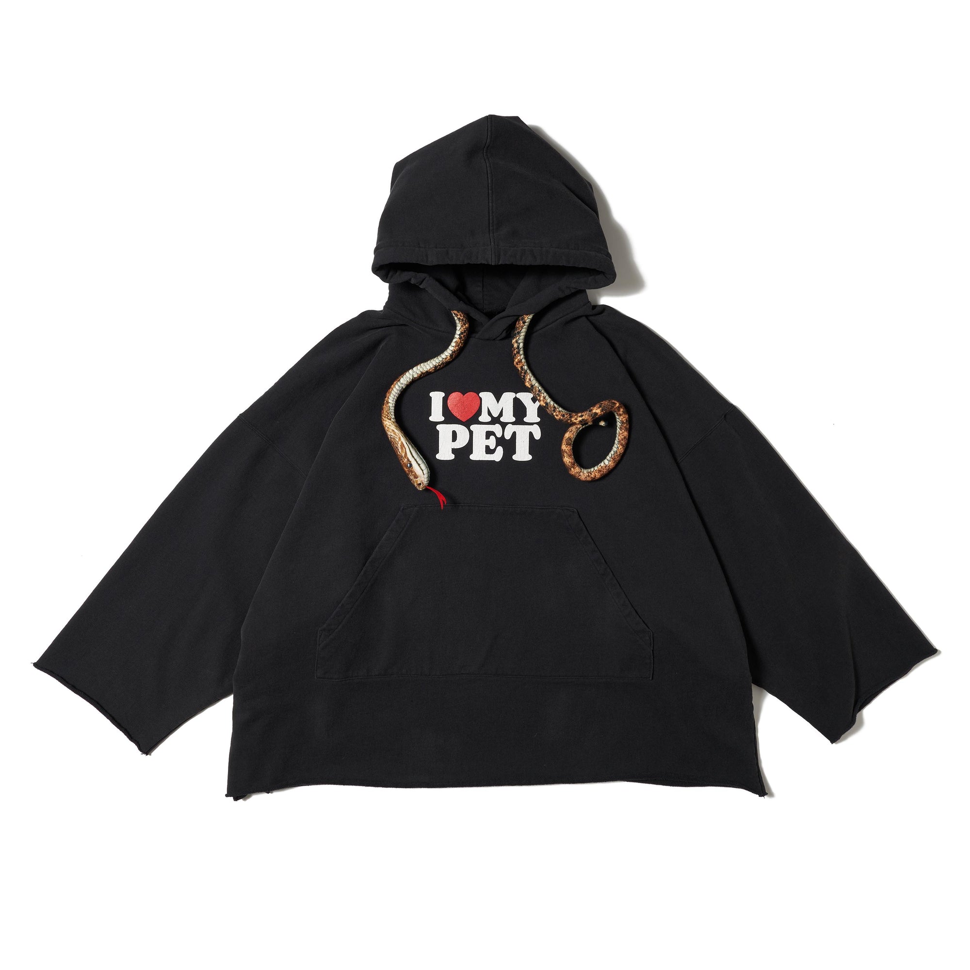 胸元に施されたプリントには、「I ♡ MY PET」のメッセージがあるように、このフーディーを着れば今日からあなたは蛇と友達です。撫でたり、名前をつけたりして可愛がってあげてください。