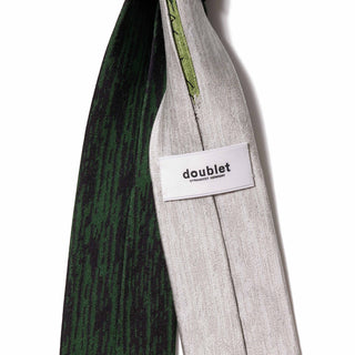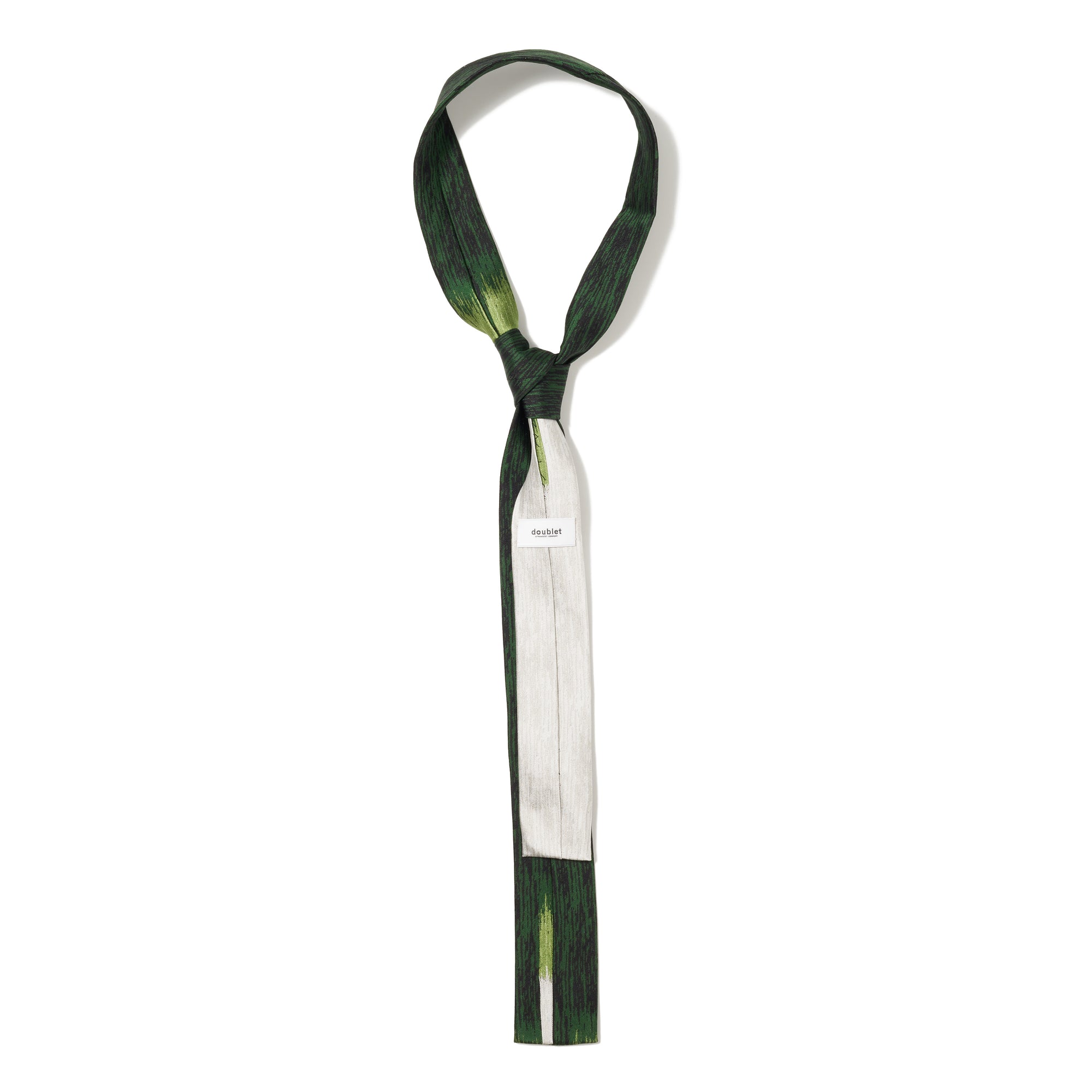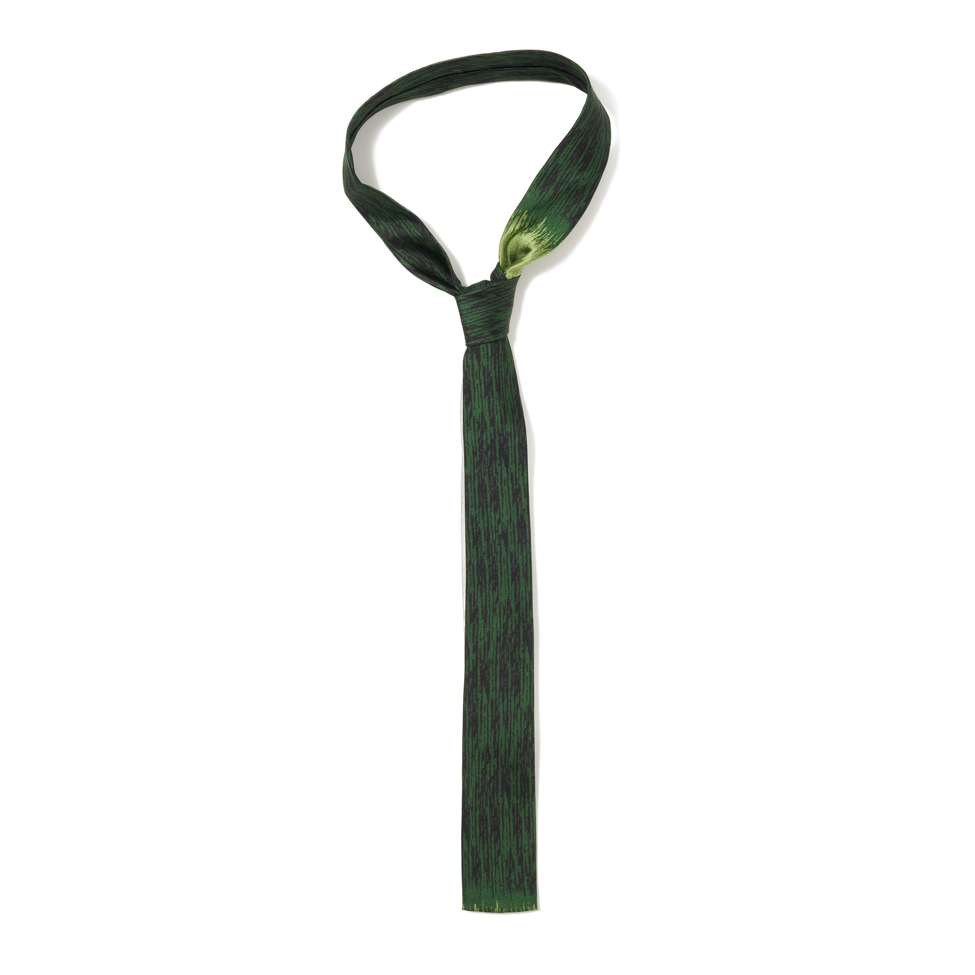 A SILK 100% TIE DESIGNED TO LOOK JUST LIKE A LONG GREEN ONION. THE GRADATION FROM WHITE TO SOFT GREEN AND THE NATURAL LUSTER OF SILK RECREATE THE FRESHNESS AND MOISTURE OF A REAL NEGI. A TIE CLIP IS INCLUDED, FEATURING A GRAPHIC INSPIRED BY THE DISTINCTIVE TAPE USED TO BUNDLE ONIONS AT THE SUPERMARKET, ADDING A HUMOROUS DETAIL.